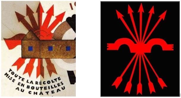Pero vamos a los elementos representados en la etiqueta de 1924, en cuya imagen se integran tres iconos muy significativos de la familia Rothschild: la silueta de los chais (las naves en las que se transforma el mosto de uva en vino), la cabeza de un carnero (mouton en francés) y un yugo con un haz de cinco flechas que aparecen superpuestas en color rojo (Las cinco flechas están presentes por partida doble en el escudo heráldico de la familia). Al margen del interés que deriva de su estética cubista, aquí arranca la carrera por resolver una incógnita que seguro ha despertado la curiosidad de muchos por la coincidencia estética entre el escudo utilizado por Falange Española, (el partido de Primo de Rivera fundado en 1933) y el yugo y las flechas que Carlu incluye en la etiqueta.